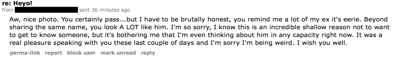 Aw, nice photo. You certainly pass…but I have to be brutally honest, you remind me a lot of my ex it’s eerie. Beyond sharing the same name, you look A LOT like him. I’m so sorry, I know this is an incredible shallow reason not to want to get to know someone, but it’s bothering me that I’m even thinking about him in any capacity right now. It was a real pleasure speaking with you these last couple of days and I’m sorry I’m being weird. I wish you well.